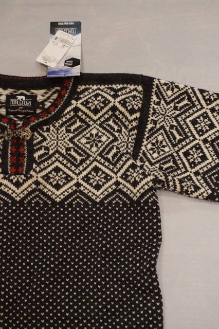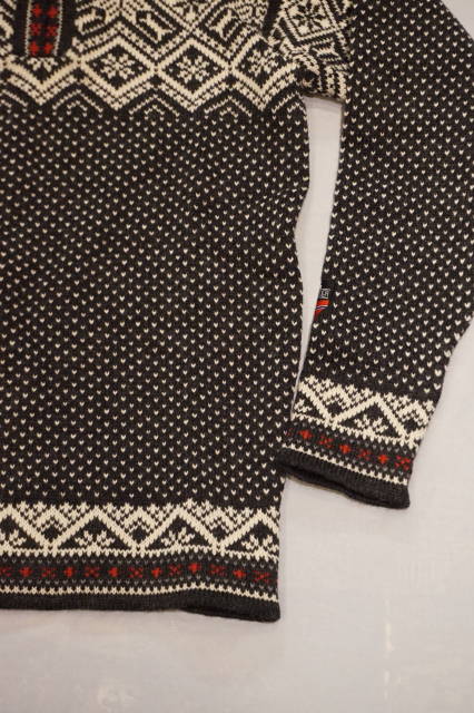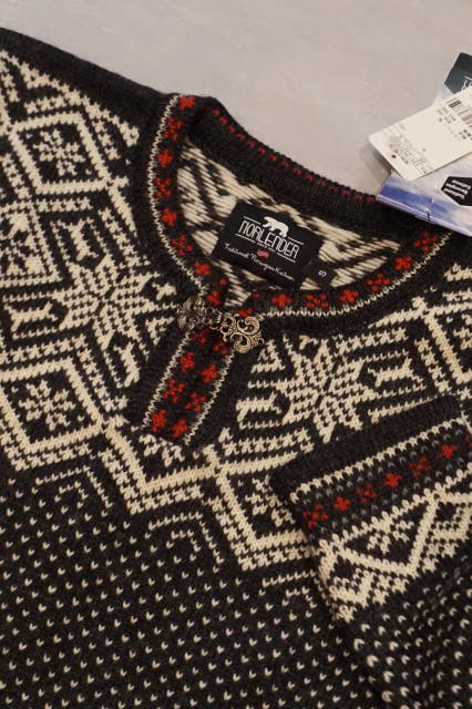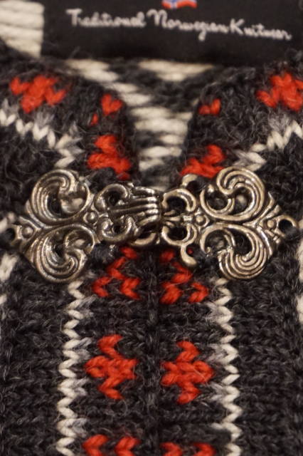 フロントはプルオーバーで、ピューター製の留め具が付いたレトロなノルウェーセーター。