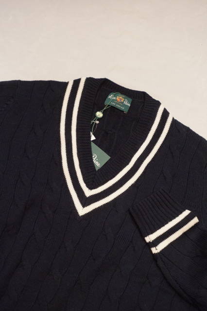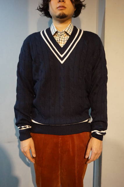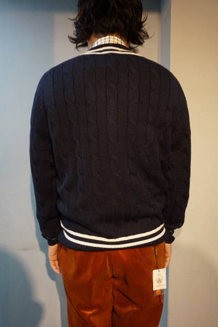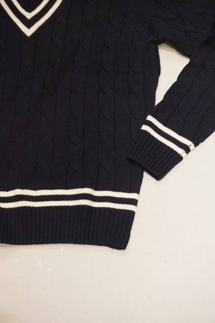 柔らかなケーブル編みのボディに浅めのVネック、襟元、裾、のストライプ等、王道のディテールは抑えつつ、